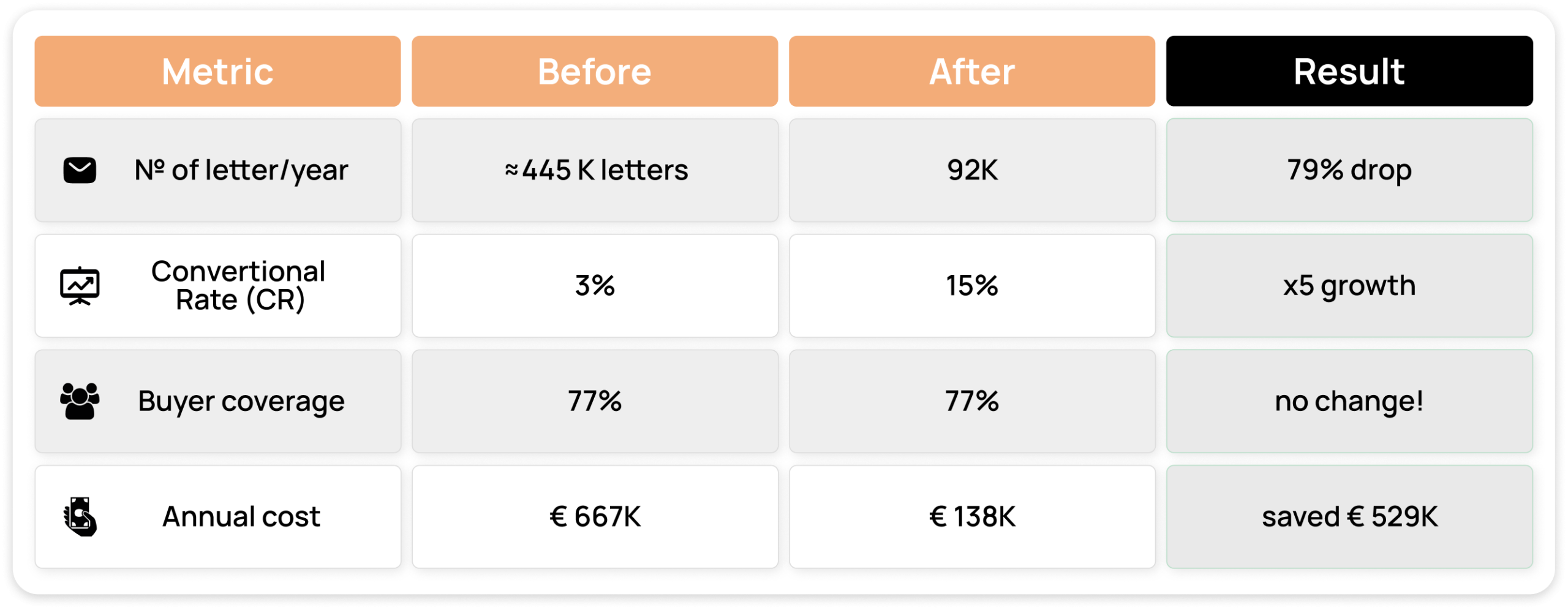 • 79% – Mailing costs dropped from €667,000 to €138,000 per year.